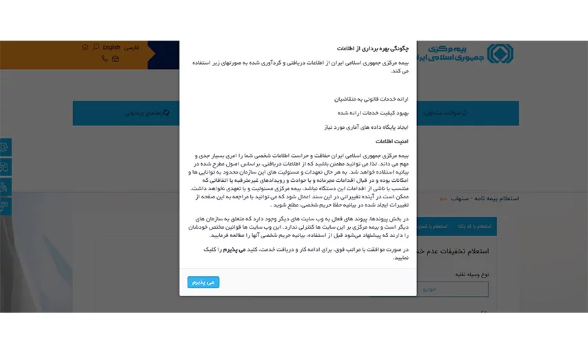 فرض کنید که از سایت بیمه بدنه ایران، وارد سایت بیمه مرکزی شدهاید. حالا برای استعلام بیمهنامه خود، باید مطابق مراحل زیر پیش بروید.