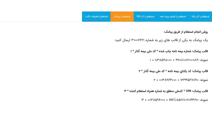 یک روش خیلی ساده برای استعلام بیمه بدنه، پیامکدادن به شمارهی ۳۰۰۰۲۶۲۱ است. طبق اطلاعات ثبتشده در سنهاب، پیامک شما باید یکی از قالبهای زیر را داشته باشد: